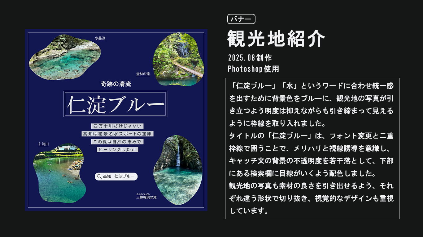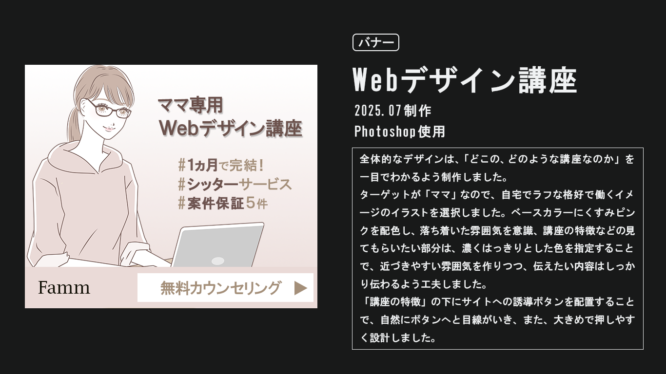 | 1995年生まれ、長野県在住。 フリーランスのWebデザイナーとして活動しています。 幼い頃からお菓子作りや手芸など、手を動かして思いを形にすることが大好きでした。 Webデザインにもその魅力を感じ、現在はバナー制作やVS Codeを使ったWeb制作を行っています。 長年接客業で培った「丁寧な対応」や「相手の気持ちを大切にする心」を活かして、クライアント様との信頼関係を大切にしながら、一緒に思いを形にしていけるよう心がけています。 ものづくりが好きな自分を強みに、一つ一つの制作にじっくり向き合い、丁寧に仕上げることを大切にしています。 お仕事を通じて、長く信頼していただける存在になれるよう日々努力しています。 |